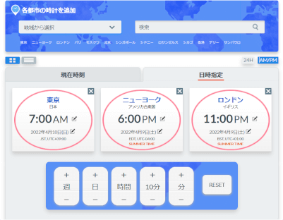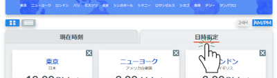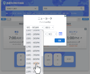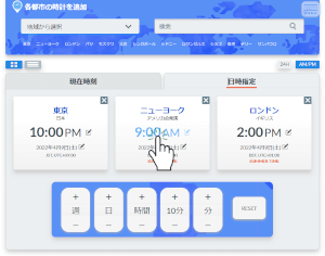 または、時計の日時をクリック(タップ)し、調べたい日時を設定します。自動的に他の時計にも反映されます。